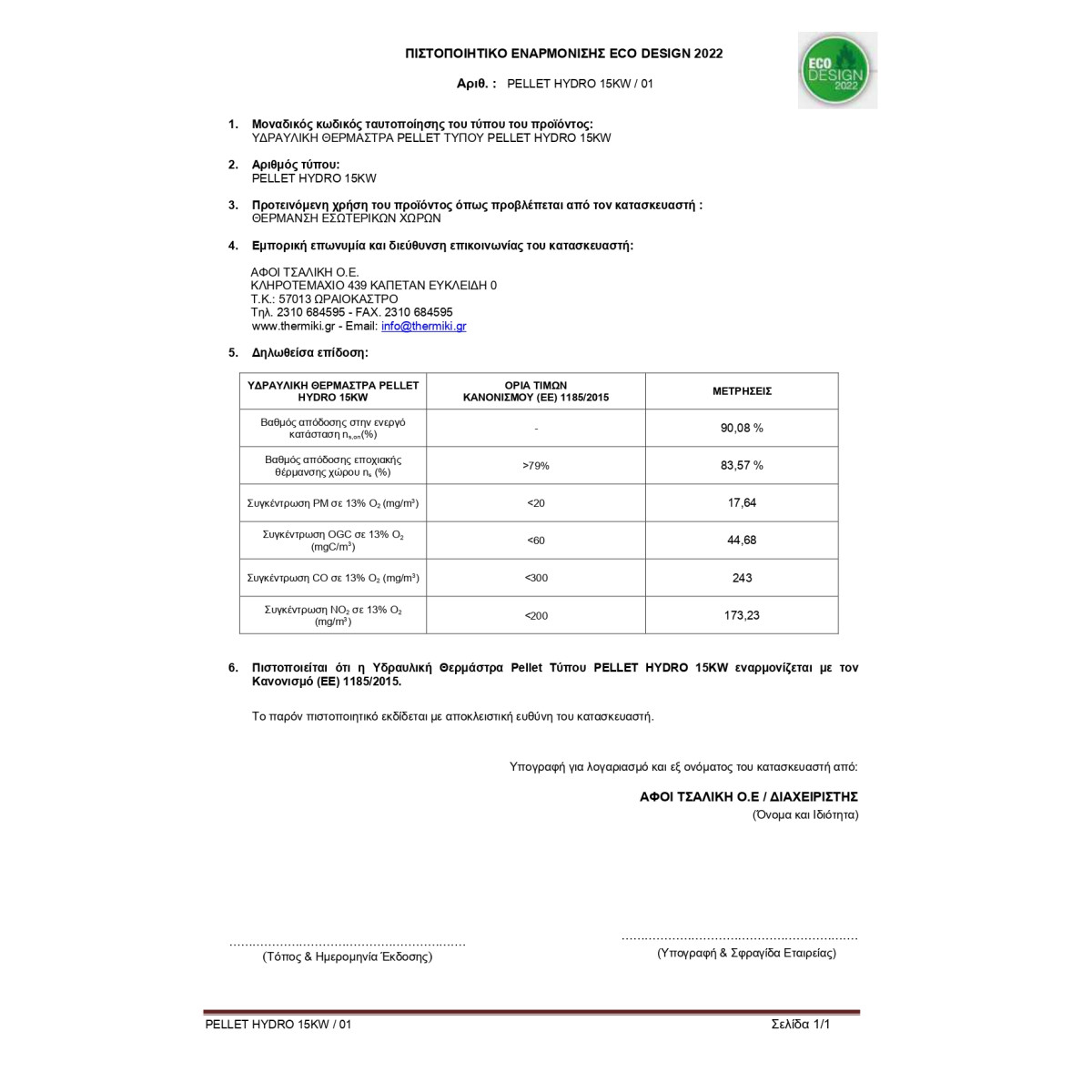 - Κατασκευαστής: THERMIKI TSALIKIS